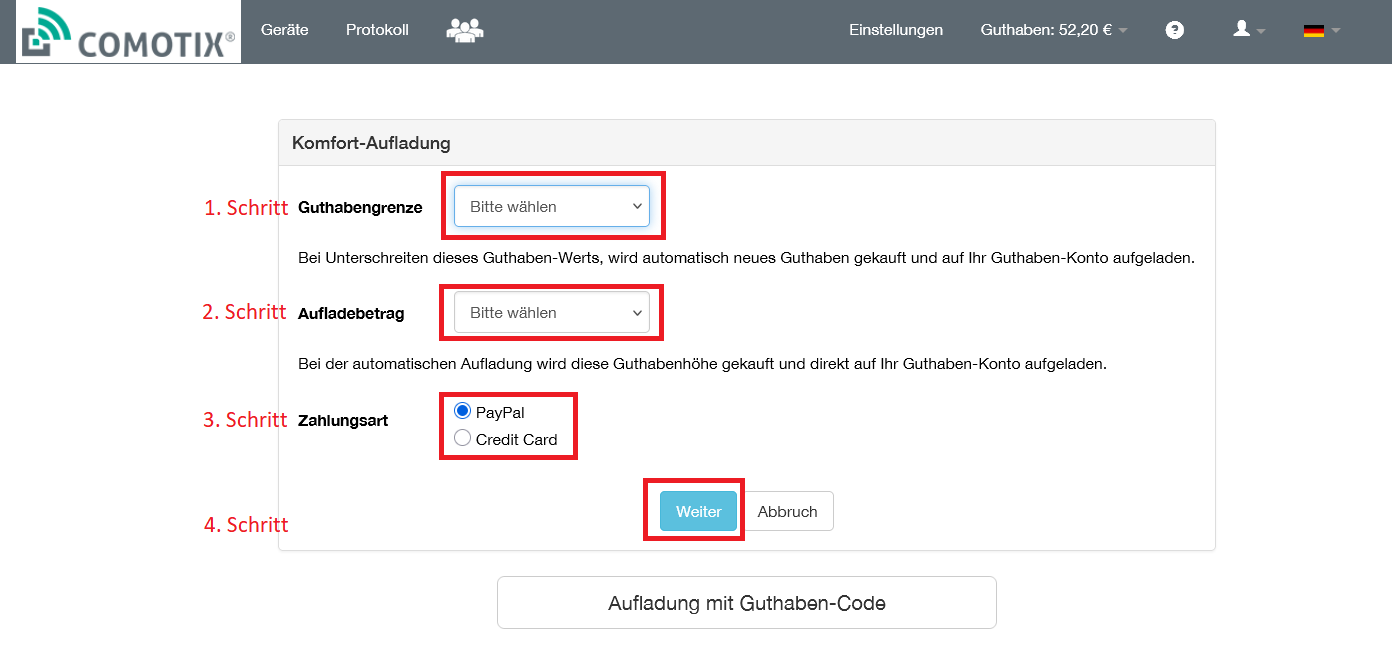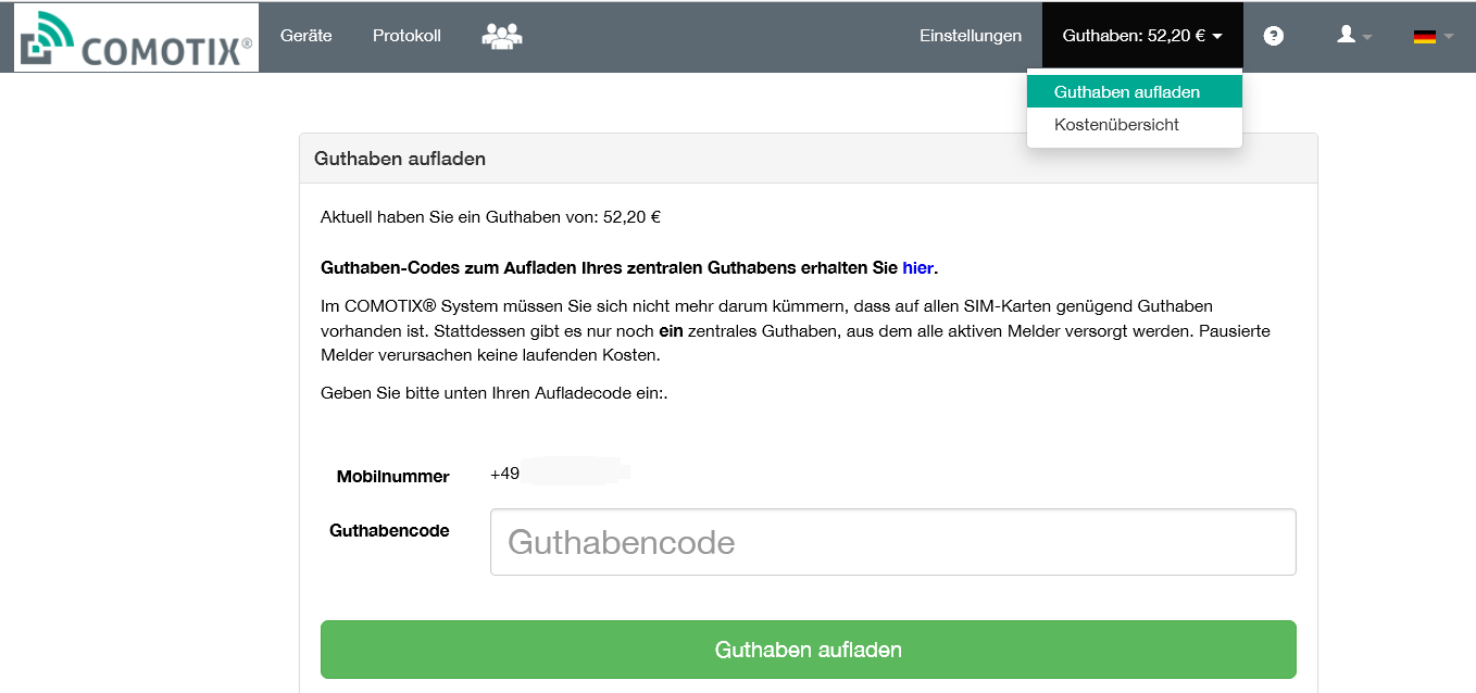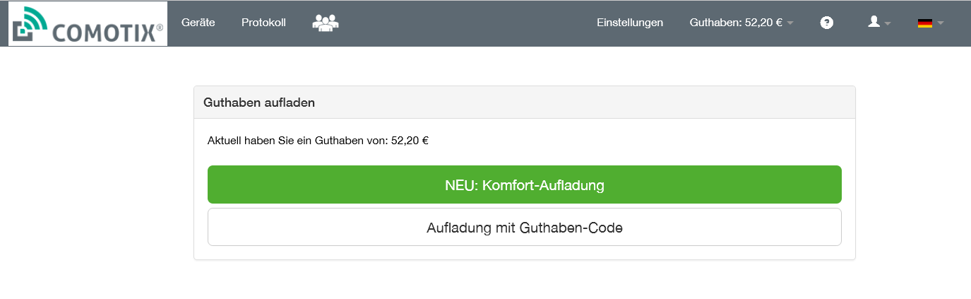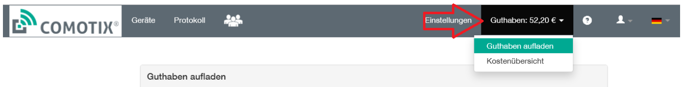 Gehen Sie auf Ihre Online-Verwaltung comotix.online und wählen „Guthaben aufladen"